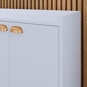 Ele conta com duas prateleiras internas e um tampo espaçoso, possibilitando a montagem de um cantinho do café.