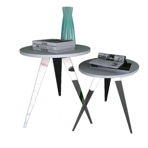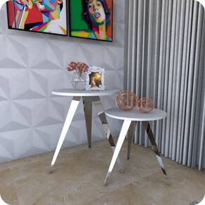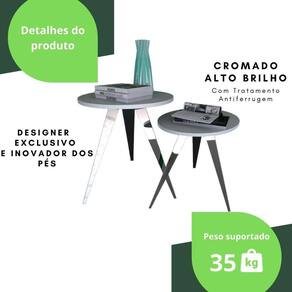 2 Mesinhas Lateral De Canto Para Sala e Quarto Redonda C.B A Mesinha de Canto Evidence é ideal para compor salas e quartos, pois seu projeto utilizam madeira e aço, o que a torna atemporal com muita versatilidade na hora de combinar cores e outros elementos para os mais diferentes estilos decorativos. Querendo uma Mesinha de Canto Exclusiva e diferente do que há no mercado para você arrasar na decoração O grande charme são os traços de seus pés com estilo retrô, fabricados em aço resistente e durável, já que recebem um lindo acabamento cromado dando um Alto Brilho, para evidenciar o tampo de madeira. Mesinha de Canto é super versátil podendo ser utilizada para colocar copos e xícaras, apoiar controles remotos, descansar livros e óculos, deixar o celular carregando, expor as bebidas, apoiar a luminária ou o abajur e entre outros. BENEFÍCIOSAcabamento PremiumResistenteQualidade garantida com Corte a Laser do AçoCromado com tratamento anti-ferrugemBatoque Emborrachado nos pés para não riscar o piso ou escorregarDesigner Exclusivo e Inovador dos Pés ESPECIFICAÇÕES TÉCNICAPeso Suportado: 35KgMaterial dos pés: AçoMaterial do Tampo: Madeira MDP 15mmAcabamento da Estrutura dos pés: CromadoCor dos pés: Alto BrilhoCor do Tampo: BrancoRequer Montagem: SimNível de Dificuldade de montagem: FácilConteúdo da Embalagem: 2 Mesas de Canto MEDIDAS:Diâmetro do Tampo: 45CmAltura dos pés: 50CmAltura Total: 51.8cm Diâmetro do Tampo: 45CmAltura dos pés: 40CmAltura Total: 41.8cm