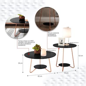 Esse conjunto dispõe de 1 mesa centro e 1 mesa apoio, ideais para decorar o ambiente e também mantê-lo organizado, visto que as mesinhas podem ser utilizadas para acomodar livros, itens decorativos e muito mais.
