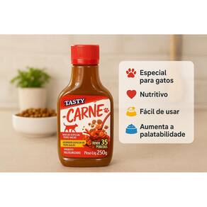 Kit 2 Molho Tasty Carne Para Gatos 250g Ração Mais Saborosa Molho Tasty Carne Para Gatos 250g O Molho Tasty Carne foi desenvolvido especialmente para gatos, tornando a ração mais atrativa e saborosa, além de contribuir para uma melhor aceitação alimentar. Benefícios: