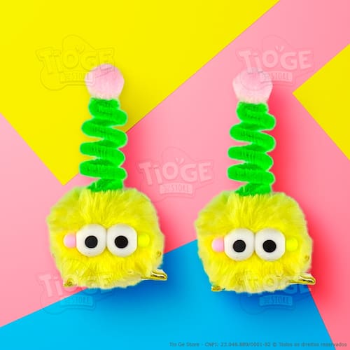 Itens da Embalagem: - 2 Monstrinhos Bolinha de Pelúcia Antena Espiral Presilha Cabelo Maluco Bichinho Olhos Grandes Fofo Engraçado na cor Amarelo e Verde.