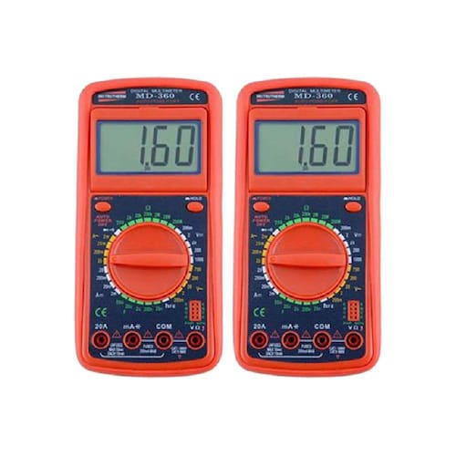KIT 2 MULTÍMETRO DIGITAL MOD.MD-360 3½ DÍG. PARA TENSÃO, CORRENTE, RESISTÊNCIA, CAPACITÂNCIA, DIODO E TRANSISTOR (HFE) DESCRIÇÃO: Multímetro digital mod.md-360 3½ díg. para tensão, corrente, resistência, capacitância, diodo e transistor (hfe) ESPECIFICAÇÕES TÉCNICAS: Display: LCD 3 ½ dígitos 2000 contagens Display inclinável até 90º Taxa de amostragem: 2/3 vezes por segundo Tensão DC: 200mV, 2V, 20V, 200V, 1000V Resolução: 100mV, 1mV, 10mV, 100mV, 1V Precisão: ± 0,5% da leitura + 1 dígito Tensão AC: 200mV, 2V, 20V, 200V, 750V Resolução: 100mV, 1mV, 10mV, 100mV, 1V Precisão: ± 0,8% da leitura + 3 dígitos Corrente DC: 2mA, 20mA, 200mA, 20A Resolução: 1µA, 10µA, 100µA, 10mA Precisão básica: ± 1,3% da leitura + 1 dígito Corrente AC: 2mA, 20mA, 200mA, 20A Resolução: 1µA, 10µA, 100µA, 10mA Precisão básica: ± 1,9% da leitura + 3 dígitos Resistência: 200?, 2K?, 20K?, 200K?, 2M?, 20M?, 200M? Resolução: 0,1?, 1?, 10?, 100?, 1k?, 10k? Precisão básica: ± 1% da leitura + 2 dígitos Capacitância: 20nF, 200nF, 2mF, 20mF, 50mF Precisão: ± 2,5% de leitura + 1 dígito. Tempo de Resposta: 2 a 3 vezes por segundo Zero automático de medição de capacitância Botão Hold: Congelamento de leitura das escalas Teste de diodo, transistor (hFE) 0~1000 e continuidade audível (Bip) Indicação de sobre-escala: "1" aparece no display Indicação automática de polaridade negativa Indicação de bateria fraca Temperatura de Operação: 0 a 40ºC Temperatura e umidade de armazenamento: -10º a 50ºC / 75% Categoria de Segurança: CAT II – 600V CAT III - 220V Alimentação: 1 Bateria de 9V Dimensões: 88 x 172 x 36mm Desligamento automático Peso: 340g ACESSÓRIOS FORNECIDOS: 2 - Multímetro MD-360 2 - Bateria de 9V 2 - Holster 2 - Pontas de prova Manual de instruções