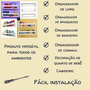 - kit com 2 prateleiras porta livros e multiuso brancas. - kit instalação do produto. - decora o quarto do seu bebê com sofisticação e beleza. - organiza seus ambientes. - incentiva a criança á leitura. - pode ser instalado em várias posições de acordo com sua necessidade. - produto versátil, perfeito para qualquer ambiente, quarto, cozinha, banheiro etc. - fácil instalação, bastando fixar na parede. - suporta até 8 kilos. Material