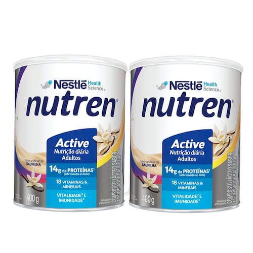 NUTREN ACTIVE BAUNILHA SUPLEMENTO ALIMENTAR NUTREN Active é complemento alimentar da Nestlé para quem necessita de um complemento da nutrição diária ou se preocupa com uma alimentação equilibrada. É o único com PREBIO¹. Composto exclusivo da Nestlé que possui fibras tais como inulina e frutooligossacarídeos-FOS, que contribuem para o equilíbrio da flora intestinal.* Possuí 25 vitaminas e minerais. 1 copo** de NUTREN® Active atende pelo menos 45% das necessidades diárias dos principais nutrientes***. Seu consumo deve estar associado a uma alimentação equilibrada e hábitos de vida saudáveis. ** 1 copo = 31,5g de NUTREN® Active + 180 mL de leite integral Valores diários de referência com base em uma dieta de 2.000kcal ou 8.400 kJ. Seus valores diários podem ser maiores ou menores dependendo de suas necessidades energéticas. NUTREN® Active é o complemento alimentar da Nestlé para jovens e adultos que buscam mais energia e disposição. Sabor: Baunilha Frase Obrigatória: CONTÉM GLÚTEN. ALÉRGICOS: CONTÉM LEITE E DERIVADOS DE SOJA. PODE CONTER TRIGO, CEVADA E AVEIA. CONTÉM GLÚTEN. Porção: 1 porção = 31,5g Modo de Preparo: 1 copo = 31,5g de Nutren® Active + 180ml de leite desnatado. Modo de Conservação: Manter a lata sempre bem fechada, em local fresco, seco e inodoro. Iniciado o uso do produto recomenda-se o consumo em até 30 dias. Consumir imediatamente após o preparo. Ingredientes: Leite em pó desnatado, açúcar, cacau em pó, frutooligossacarídeos, gordura láctea, inulina, minerais, vitaminas, espessante carragena, emulsificante lecitina de soja e aromatizante. Ean: 7891000234006