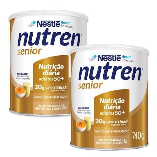 Composto Lácteo Nutren Senior Sem Sabor 740g NUTREN Senior é o suplemento nutricional da Nestlé desenvolvido pensando nas necessidades de quem já passou dos 50 anos e ainda tem muito o que aproveitar. Contém ACT-3, combinação única de cálcio, proteína e vitamina D, além de fornecer outras vitaminas e minerais. NUTREN Senior é versátil, pois não tem sabor. Pode ser misturado em receitas salgadas e doces. Nutren Senior, a melhor fase da vida é agora! Indicação: Desenvolvido pensado nas necessidades nutricionais de quem já passou dos 50 anos e ainda tem muito o que aproveitar. Modo de Preparo: Adicionar 6 colheres de sopa rasa (55g) a água e mexa bem. NUTREN® Senior não tem sabor, por isso pode ser adicionado ao final das receitas doces ou salgadas de sua preferência. Não pode ser fervido. Validade: Data de validade indicada no fundo da embalagem Ingredientes: Leite em pó desnatado, maltodextrina, proteína isolada do soro de leite da vaca, caseinato de cálcio obtido do leite da vaca, gordura láctea, frutooligossacarídeos, inulina, minerais (citrato de cálcio, carbonato de magnésio, sulfato ferroso, sulfato de zinco, fosfato de cálcio tribásico, sulfato de mangânes, sulfato de cobre e selenato de sódio), vitaminas (L-ascorbato de sódio, bitartarato de colina, acetato de DL-alfa-tocoferila, mio-inositol, colecalciferol, acetato de retinila, niacinamida, D-pantotenato de cálcio, tiamina mononitrato, cloridrato de piridoxina, filoquinona,riboflavina, ácido N-pteroil-L-glutâmico, cianocobalamina e D-biotina) e emulsificante lecitina de soja. NÃO CONTÉM GLÚTEN. ALÉRGICOS: CONTÉM DERIVADOS DE LEITE E SOJA. Sabor: Sem Sabor País de Origem: Brasil Frase Obrigatória: NÃO CONTÉM GLÚTEN. Modo de Conservação: Iniciado o uso do produto recomenda-se o consumo em até 30 dias. Consumir imediatamente após o preparo. Manter a lata sempre bem fechada em local seco, fresco e inodoro. Alergênicos: NÃO CONTÉM GLÚTEN. ALÉRGICOS: CONTÉM DERIVADOS DE LEITE E SOJA.