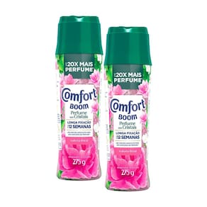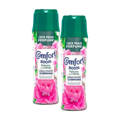 O kit contém: 2 Odorizantes de Roupas Comfort Boom Perfume em Cristais Euforia Floral com 275g cada
