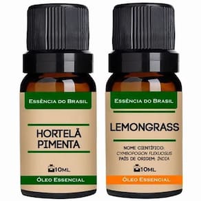 Esse kit é composto por 2 óleos essenciais puros e naturais. Conheça: Óleo Essencial Hortelã Pimenta 10 Ml - Puro E Natural Nome do produto: Óleo Essencial de Menta Piperita Nome INCI: Mentha piperita Oil Nome científico: Mentha piperita Nome em inglês e francês: peppermint / menthe poivrée Origem: Estados Unidos / Índia Extração: destilação a vapor das folhas Principal componente: mentol Descrição: líquido incolor a amarelo palha, de odor herbal mentolado característico Utilização: Um dos óleos essenciais mais importantes. Estimula, refresca, resfria, restaura mente e corpo. Adiciona-se a óleo de massagem abdominal para ativar o sistema digestivo. Excelente para refrescar pés e cabeça cansada. Mistura-se bem com os óleos essenciais de bergamota, gerânio, lavanda, alecrim e manjerona. Observação: Evitar uso durante a gravidez. Utilizar em pequenas quantidades, pois pode causar irritação na pele. Óleo Essencial De Lemongrass 10ml - Puro E Natural - Nome INCI: Cymbopogon flexuosus Oil Nome científico: Cymbopogon flexuosus Nome em inglês e francês: lemongrass / lemongrass Origem: Índia Extração: destilação a vapor das folhas Principal componente: citral Descrição: líquido amarelo palha a alaranjado, de odor fresco, encorpado de limão. Utilização: Um tônico e purificador para o corpo, muito utilizado em shampoos para dar brilho aos cabelos. Um óleo antisséptico e adstringente. Possui aroma forte de limão o que o torna um ótimo óleo refrescante e desodorizante de ambiente. Utilizado em músculos doloridos, para estimular a circulação. Também é útil como repelente de insetos. Mistura-se muito bem com os óleos essenciais de gerânio, jasmim e lavanda. Observação: Não aplique diretamente na pele. Utilize em pequenas quantidades. Marca: Essencia Brasil Ean: 7897920132354