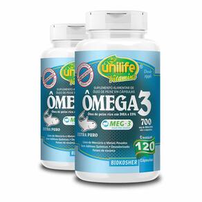 Kit 2 ômega 3 óleo de peixe 700mg unilife 120 cápsulas Ômega 3 unilife 120 cápsulas O melhor ômega 3 desodorizado O ômega 3 óleo de peixe possui diversos benefícios para saúde, ajudando a prevenir doenças no sistema cardiovascular. O corpo humano não é capaz de produzir ômega 3, tendo que obtê-lo da alimentação. O ômega 3, quando devidamente consumido, reduz o risco de desenvolver algumas doenças. É rico em ácido graxo poli-insaturado de cadeia longa epa e dha, livre de mercúrio e metais pesados, sem aditivos químicos e sem odor. Ômega 3 benefícios: O ômega 3 traz diversos benefícios à saúde, mais especificamente à cardiovascular; No organismo ajuda a desencadear efeitos de proteção ao coração; Atua nos triglicerídeos plasmáticos auxiliando na sua redução e como consequência auxilia na redução do total. Ômega 3 como tomar Sugere-se a ingestão de 2 a 4 cápsulas ao dia, após as refeições. Ingerir com líquido. Ingredientes do ômega 3 unilife Óleo de peixe. Cápsula: gelatina bovina e água. Omega 3 é extraído de peixes de escama, como a anchova e a sardinha. Cada cápsula contém 1000 mg de óleo de peixe, dos quais 195 mg são de ácido eicosapentaenoico epa e 122 mg são de ácido decosahexaenoico dha . Peso total da cápsula: 1200mg. Não contém glúten. Marca: Não Informado