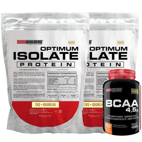 Kit 2x Optimum Isolate Whey Protein 2kg + BCAA 100g - Bodybuilders Sabor: Baunilha Kit composto por: 2x Optimum Isolate Whey Protein 2kg + Bcaa 100g - BodybuildersOptimum Isolate ProteinOptimum Isolate Protein Bodybuilders é um suplemento que conta com a combinação de quatro proteínas potencializadas, desenvolvido especialmente para as pessoas que buscam o ganho de massa magra, força muscular, mais energia durante os treinos e o aumento e capacidade do corpo de reparar os músculos pós-treino.Proteína isolada do soro do leiteA proteína isolada do soro do leite, popularmente conhecido como Whey Protein isolada, contém aproximadamente 90% de proteínas e por sofrer o processo de filtração possui um grau de pureza maior sendo removidas a gordura e lactose. No geral, as etapas de processamento usadas na produção de soro do leite isolado resultam em maior teor de proteína e menor teor de gordura e carboidrato por porção.No geral, as etapas de processamento usadas na produção de soro do leite isolado resultam em maior teor de proteína e menor teor de gordura e carboidrato por porção.O BCAA é um suplemento altamente utilizado por pessoas que buscam levar uma vida mais saudável em conciliação com uma alimentação também saudável e a prática de atividades físicas. O BCAA faz parte dos aminoácidos de cadeia ramificada contendo em sua fórmula: Leucina, Valina e Isoleucina. Essas mesmas moléculas presentes no BCAA são encontradas nas fibras musculares, porém em maior quantidade, equivalendo 35% dos principais aminoácidos presente na proteína muscular. Elementos esses que contribuem para uma recuperação rápida e eficaz dos exercícios físicos praticados e no ganho de massa. Por essa razão são tão importantes para quem treina pesado.Pensando no desenvolvimento dos atletas que buscam praticidade e rapidez de consumo no dia a dia, a Bodybuilders desenvolveu o BCAA 4,5g POWDER 100g.
