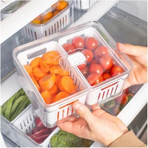 O organizador de geladeira Clear Fresh com cesto duplo 2,2L promove frescor prolongado para os alimentos, para uma rotina mais saudável e sem desperdícios. O sistema de ventilação mantém o nível de umidade ideal para cada alimento. A armazenagem com cestos evita que as frutas, verduras e legumes fiquem molhados após a lavagem, aumentando a durabilidade dos alimentos.