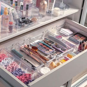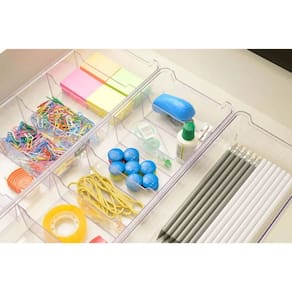 Os organizadores de gavetas da linha Descomplica são indicados para organizar e armazenar itens de home office, higiene ou beleza em closets, armários ou gavetas. Fabricados em plástico texturizado na cor transparente, os organizadores retangulares são fáceis de compor em qualquer ambiente, oferecendo funcionalidade e beleza. Com design versátil, permitem diversas soluções de organização, adaptando-se às suas necessidades.