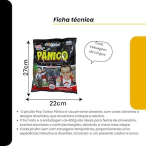 Contém: 2 pacotes de 400 g de pirulitos Pânico pop que tatuam temporariamente a língua com um desenho . Pirulito sabor Tutti-frutti, colorido e aromatizado artificialmente. Pirulito com tatuagem de língua Pânico O pirulito tattoo é uma nova sensação: ele é capaz de tatuar temporariamente a língua com uma figura. Para conseguir o melhor efeito, pressione o pirulito por um tempo sobre a língua, sem mover. Ótimo para distribuir a crianças no final da festa, pois irão se divertir muito As estampas são e temáticas de acordo com o pacote. A Festa de todo mundo fica muito mais doce com guloseimas, docinhos e pirulitos. Adoce sua festa com doces para criançada. Com certeza será uma sensação entre as crianças e também entre os adultos Experiência Divertida: Destaque o diferencial do pirulito com tatuagens de língua, proporcionando uma experiência interativa e divertida que encanta crianças e provoca sorrisos. Sabor Incrível: Informe sobre os sabores deliciosos que acompanham cada pirulito, garantindo que a diversão venha com um gosto irresistível que todos adoram. Ideal para Eventos Temáticos: Enfatize que esses pirulitos são perfeitos para festas de aniversário, especialmente com o tema de princesas, adicionando um toque especial e único à celebração. Formato Atrativo: Atraia a atenção para o design charmoso e colorido dos pirulitos, que não só são gostosos, mas também atraem visualmente, tornando-os irresistíveis para os pequenos. Marca: Não Informado Ean: 7794670621155