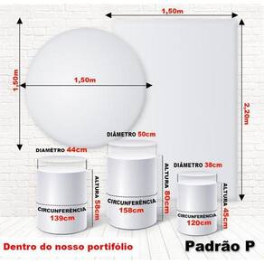 Especificações do produto:Os painéis são produzidos com qualidade fotográfica em impressão sublimática digital de última tecnologia.Estamos sempre atentos às novidades e tendência do mercado.O material utilizado é tecido malha flexível poliéster com elástano 240g/ml de ótimo caimento e não reflete luz.O melhor disso tudo não amassa. Isso é o sonho de todo decorador.Possui costura overlock nas laterais para não desfiar e elástico no redondo.Pode ser molhado ou lavado com água e sabão neutro, evite ser exposto ao sol pois secam rapidamente.As cores dos produtos podem variar de tonalidade em 15% devido resolução do monitor ou tela do celular, mas nada que interfira na qualidade e beleza do mesmo.Garantia contra defeito de fabricação.Sobre efeitos 3d, 4k, 8k e glitter:São efeitos que não podem serem visto à olho nu, somente por trás de lentes de câmeras.Vou dar um exemplo quando vamos no cinema e tiramos o óculos fica turvo e aparentemente tremidas as imagens e assim são o mesmo com as imagens impressas.Façam o teste se não conhecerem dos efeitos e verão o quanto ficam lindas e maravilhosas e encante seu público alvo.Painel redondo: Painel redondo 1,50m de diâmetro Não acompanha estruturaCapas de cilindro: Não acompanha cilindros de mdf Medidas padrão p do anúncio Cilindro grande: altura: 80 cm x diâmetro: 50 cm x circunferência: 157 cm Cilindro médio: altura: 58 cm x diâmetro: 44 cm x circunferência: 141 cm Cilindro pequeno: altura: 45 cm x diâmetro: 38 cm x circunferência: 119 cmPainel retangular: Painel vertical com passa varão 1,50 (largura) x 2,20 (altura). Não acompanha estrutura.Atenção clientes: Não fazemos alterações em imagens e em medidas do painel e dos cilindros tem que ser como o padrão do anúncio. Não aceitamos artes prontas e inclusão de nomes. Marca: Felicitá