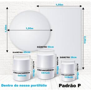 Capas de cilindro: Não acompanha cilindros de mdf Medidas padrão p do anúncio Cilindro grande: altura: 80 cm x diâmetro: 50 cm x circunferência: 157 cm Cilindro médio: altura: 58 cm x diâmetro: 44 cm x circunferência: 141 cm Cilindro pequeno: altura: 45 cm x diâmetro: 38 cm x circunferência: 119 cm