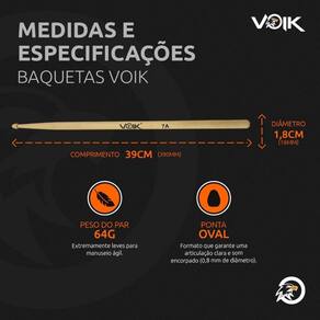 Especificações • Marca: Voik • Modelo: 5A • Madeira: Maple • Formato da Ponta: Oval • Diâmetro da baqueta: 1,8 mm • Diâmetro da ponta da baqueta: 0,8 mm • Comprimento: 40 cm • Peso do par: 68 g