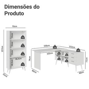 Em L: 74 cm de altura x 150 cm para um lado x 152 cm para o outro.