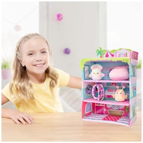 Bem vindo ao Blue Seas Inn no calçadão de Squishville Este luxuoso hotel cinco estrelas é conhecido por suas incríveis festas na piscina e acomodações luxuosas Leve a turista Balia em sua mala e faça o check in no saguão. Depois de descansar na fabulosa suíte do segundo andar, aproveite a deliciosa espreguiçadeira rosa choque no salão de festas do terceiro andar, onde o DJ Briannika toca batidas quentes Não se esqueça de dar um mergulho na piscina da cobertura e relaxar em uma das cabanas. O Playset Squishville inclui acessórios como a turista Balia e a espreguiçadeira rosa quente, além dos Squishmallows de 2 polegadas, Briannika, o pavão, e Balia, a borboleta. Construa seu mundo de Squishville com conjuntos de jogos e muito mais. Aproveite sua estadia no Blue Seas Inn