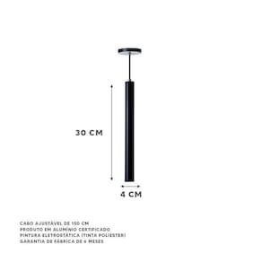 Especificações Técnicas: Marca: Ideallume Modelo: Tubo Redondo Fixação: Teto Tipo de uso: Interno Pintura: Eletrostática - Tinta: microtextura poliéster Cor: Preto Material : Alumínio Voltagem Do Pendente: Bivolt 110/220v Soquete: Gu10 para Mr11 Medidas (A x D): 30cm x 4 cm Lâmpada: Utiliza 1 lâmpada (Não inclusa)