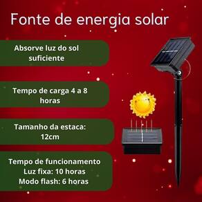 Pisca Pisca Led possui uma placa solar que carrega a bateria durante o dia, e ao anoitecer, ele possui um acionamento automático sem necessidade de ligar manualmente. Não precisa de Tomada, fácil de ser instalado. 100% à prova d'água e possui longa vida útil. 8horas de Funcionamento Com 2 Modos de Iluminação. Fixo ou Pisca-pisca com 8 efeitos Luz Colorida com Amarelo