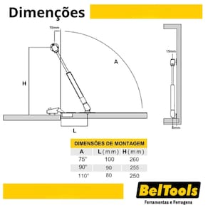 Pistão a Gás para 6 Kg de força inversa, com abertura de 75° a 110°, ideal para portas em madeira ou com perfil de alumínio com abertura para baixo.