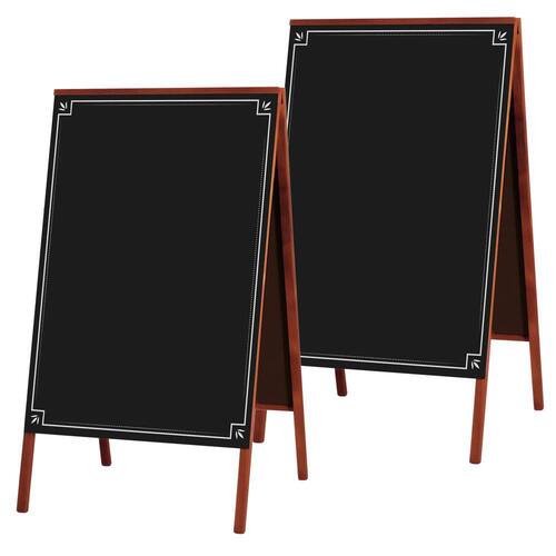 Kit 2 Placa Lousa Quadro Cavalete Propaganda Comércio Dupla Face Madeira Mogno 85x50 cm Preto Fosco ou Preto Fosco Decorado - Ideal para cardápio de restaurantes, bares, cafeterias, padarias, lanchonetes supermercados açougues, O cavalete é apaptavel a divesos tipos de comércios. O quadro negro fosco destaca bem o giz branco e os coloridoses. A moldura em mogno tem um apelo de maior sobriedade e sofisticação combinando com as áreas gourmet.