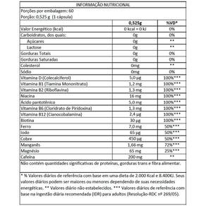 Vitamina d colecalciferol , vitamina b1 tiamina mononitrato , vitamina b2 riboflavina , niacina, ácido pantotênico, vitamina b6 cloridrato de piridoxina , vitamina b12 cianocobalamina , biotina, ferro, iodo, cobre, manganês, magnésio, cafeína. Antiumectantes: fosfato tribásico de cálcio, celulose microcristalina ins 460i e dióxido de silício ins 551 , gelificante gelatina ins 428 e estearato de magnésio e corantes dióxido de titânio, amarelo crepúsculo, vermelho 40, amarelo de quinoleína e azorrubina.