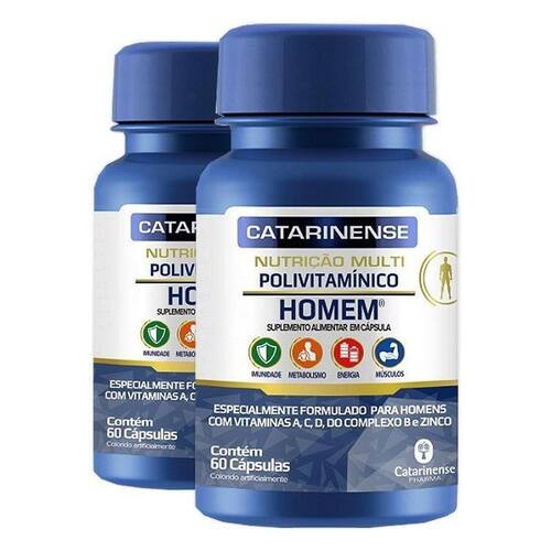 Kit 2 Polivitamínico Homem Catarinense 60 cápsulas Homem foi desenvolvido com base nas necessidades nutricionais específicas dos Homens. Sua composição de nutrientes foi cuidadosamente escolhida de modo a complementar a ingestão de vitaminas e minerais, essenciais para a saúde e o bem-estar dos homens. Não engorda e não contém glúten. Ingestão Recomendada Recomenda-se ingerir 1 cápsula ao dia, que atende a Ingestão Diária Recomendada IDR descrita na tabela de Informação Nutricional. Deve ser ingerido com líquido. Marca: Não Informado