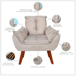 As poltronas decorativa impala proporciona um toque de charme e beleza em seu lar, feita com matéria prima de primeira qualidade, revestida de fibra e percinta no encosto e espuma no assento.Especificações:- estrutura: mdf e eucalipto- tecido: suede- pés: madeiraDimensões externas:Altura : 89 cmLargura: 86 cmComprimento: 86 cmDimensões internas:Altura encosto x assento: 53 cmAltura do chão até o assento: 50 cmProfundidade do assento: 52 cmLargura do assento: 46 cmPés palito envernizados cor melPeso suportado: até 100 kg sem impactoGarantia de fábrica 90 dias para somente defeito de fábrica. AtençãoInstruções de limpeza: utilizar um pano limpo e seco. Não limpar com escovas ou produtos abrasivos,No prazo de garantia não é permitido fazer impermeabilização, pois caso seja feita perde totalmente garantia.Obs: este produto é recomendado para ambientes residenciais em áreas internas, por isso, não o deixe exposto à luz direta do sol, para que não sofra alteração na corMontagem é simples e dever do cliente somente rosquear os pés . Em caso de devolução do produtoAceitaremos a devolução nós seguinte termos.O produto deverá ser embalado da mesma forma que foi entregue, não deverá ter rasgos ou esteja com fissuras. Deverá ser etiquetado de igual modo para que não haja extravio, deverá ter nota de devolução. O produto não poderá estar danificado ou com marcas de uso Informamos que o horário de coleta é horário somente comercial.Fica acordado que finalizar a compra estou totalmente de acordo com toda descrição a qual fui informado através do anuncio a qual afirmo no ato da finalização da compra ter lido.Qualquer duvida estamos a disposição. Marca: Decore.Com
