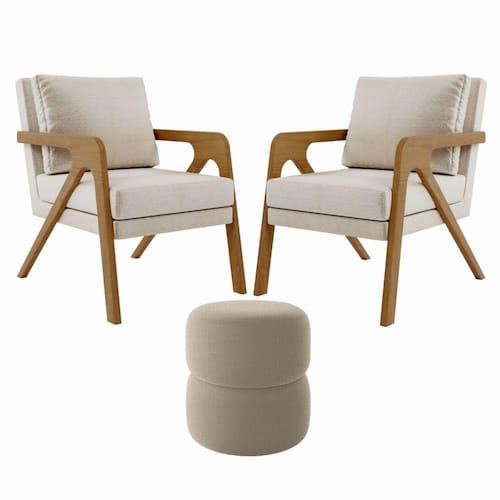 Kit Poltrona com Puff Escritório Luxo Aira Madeira Maciça, Confortável e Sofisticada