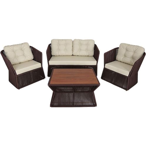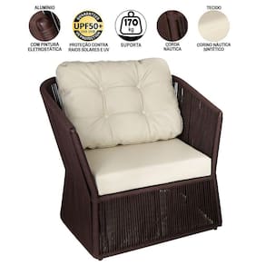 Conjunto New York com 2 Poltronas, 1 Namoradeira e Mesa de Centro Baixa em Alumínio, Corda Náutica e Assento e Mesa com Tampo em Madeira Cumaru Trama