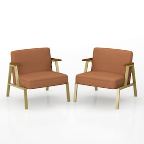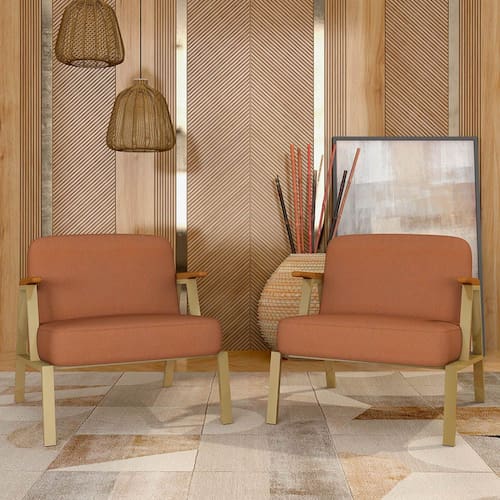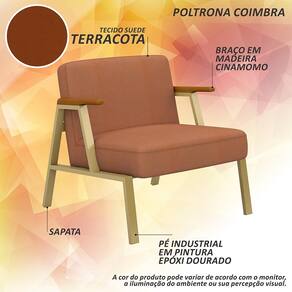 Detalhes Técnicos das Poltronas - Assento e Encosto Tapeçados, Estofados e Fixos - Espuma do Assento e do Encosto: D20 - Tonalidade Estrutura: Dourado/Cinamomo - Tonalidade do Tecido: Suede Terracota - Material: Estrutura em Metalon | Braço em Madeira - Medida Poltrona: A: 72CM x L: 73CM x P: 78CM - Medida do chão até o assento: 42cm de altura - Poltrona suporta até 120KG - Montagem: Difícil