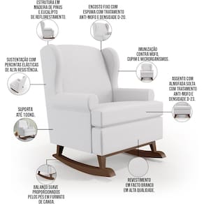 Características: Estrutura em madeira de pinus e eucalipto de reflorestamento, com imunização contra mofo, cupim e microrganismos. Revestimento em Facto Branco Fosco de alta qualidade. Encosto fixo com percintas elásticas, espuma D-23 e tratamento antimofo. Assento com espuma D-20, tratamento antimofo e almofada solta. Sustentação com percintas elásticas de alta resistência. Base com pés em formato de canoa e balanço suave. Peso suportado: Até 100 kg.