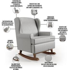 Características: Estrutura em madeira de pinus e eucalipto de reflorestamento, com imunização contra mofo, cupim e microrganismos. Revestimento em Facto Cinza Metalizado de alta qualidade. Encosto fixo com percintas elásticas, espuma D-23 e tratamento antimofo. Assento com espuma D-20, tratamento antimofo e almofada solta. Sustentação com percintas elásticas de alta resistência. Base com pés em formato de canoa e balanço suave. Peso suportado: Até 100 kg.