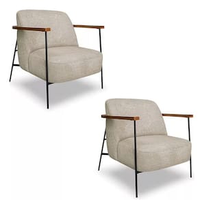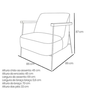 Medidas:Altura total: 87 cmLargura total: 86 cmProfundidade total: 86 cmPeso: 19,8 kgTecido: Linho BouclêEstrutura: Madeira EucaliptoMaterial da base: Aço carbonoBraço em madeira maciçaDensidade da Espuma do Assento: HR28 com plumante em siliconeDensidade da Espuma do Encosto: HR23 100% fibra siliconadaAlmofada: FixaPeso Suportado: 120 kgMontagem: O produto vai montado.