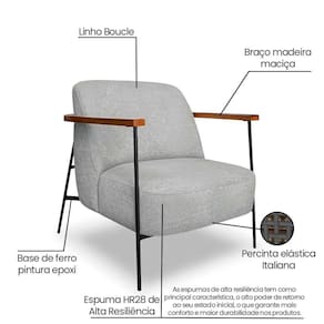 Medidas:Altura total: 87 cmLargura total: 86 cmProfundidade total: 86 cmPeso: 19,8 kgTecido: Linho BouclêEstrutura: Madeira EucaliptoMaterial da base: Aço carbonoBraço em madeira maciçaDensidade da Espuma do Assento: HR28 com plumante em siliconeDensidade da Espuma do Encosto: HR23 100% fibra siliconadaAlmofada: FixaPeso Suportado: 120 kgMontagem: O produto vai montado.