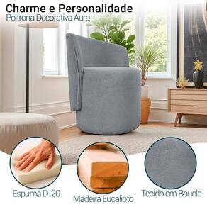 A Poltrona Aura combina elegância e conforto em um design compacto, perfeito para ambientes modernos e aconchegantes. Revestida com tecido bouclé, traz um toque de sofisticação e maciez ao espaço, é a escolha certa para quem busca qualidade, estilo e conforto em uma só peça.