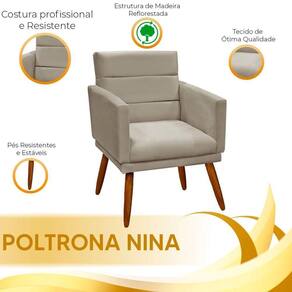 A Poltrona Decorativa Nina dara um toque de charme e beleza ao seu espaco, seja ele domiciliar ou . Ela foi desenvolvida com toques que elevam o seu conforto: seu rodape na base da estrutura proporciona estabilidade e altura, e seu lindo detalhe nos veios da espuma do encosto, revestido com veludo de toque suave, ira atrair olhares das visitas ou clientes. Esta poltrona proporciona todo o aconchego que voce precisa!
