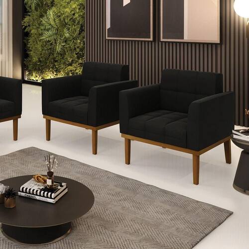 Kit 2 Poltronas Decorativas Karen Pés Fixo Em Madeira Castanho Suede Preto G19 - Gran Belo