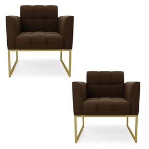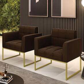 Você gosta de colecionar vários momentos memoráveis com sua família e amigos? Que tal recebê-los, com móveis de altíssima qualidade que só a DRossi tem? O Kit 2 Poltronas Elisa é adequado para você! Seu design retrô é a grande tendência do momento. Pode ser utilizado em diversos espaços da casa, em salas, hall de entrada, quartos, cozinhas, varanda, sacada, escritório, dentre outros. Contém as seguintes características: A estrutura é feita de madeira de Eucalipto 100% de reflorestamento, e a Base Industrial Metálica Dourada, além de ser resistente e durável, suporta em média até 120 kg. Assento, encosto e braços, contém enchimento de espuma D-23 e é estofada em tecido Suede, no tom Marrom, que oferece muito conforto e resistência ao sentar, com aquela sensação de maciez e aconchego. Possui também, detalhes de costura no encosto e assento, resultando em um acabamento impecável, conferindo muito mais valor e elegância ao seu espaço. Para complementar a decoração com essas lindas poltronas, a dica é utilizar mantas, almofadas ou vasinho de flor. E pronto, seu cantinho estará perfeito para descansar e relaxar! Aqui, você encontra várias opções, para que seus amigos e familiares se sintam acolhidos. Garanta já seu Kit 2 Poltronas.
