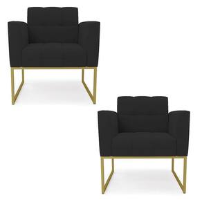 Você gosta de colecionar vários momentos memoráveis com sua família e amigos? Que tal recebê-los, com móveis de altíssima qualidade que só a DRossi tem? O Kit 2 Poltronas Elisa é adequado para você! Seu design retrô é a grande tendência do momento. Pode ser utilizado em diversos espaços da casa, em salas, hall de entrada, quartos, cozinhas, varanda, sacada, escritório, dentre outros. Contém as seguintes características: A estrutura é feita de madeira de Eucalipto 100% de reflorestamento, e a Base Metálica Industrial Dourado, além de ser resistente e durável, suporta em média até 120 kg. Assento, encosto e braços, contém enchimento de espuma D-23 e é estofada em tecido Veludo, no tom Preto, que oferece muito conforto e resistência ao sentar, com aquela sensação de maciez e aconchego. Possui também, detalhes de costura no encosto e assento, resultando em um acabamento impecável, conferindo muito mais valor e elegância ao seu espaço. Para complementar a decoração com essas lindas poltronas, a dica é utilizar mantas, almofadas ou vasinho de flor. E pronto, seu cantinho estará perfeito para descansar e relaxar! Aqui, você encontra várias opções, para que seus amigos e familiares se sintam acolhidos. Garanta já seu Kit 2 Poltronas.