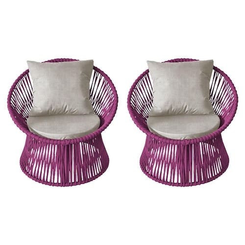 IMAGENS MERAMENTE ILUSTRATIVAS REALIZADO EDIÇÃO, PODENDO HAVER UMA PEQUENA VARIAÇÃO DE COR DEPENDENDO DE CADA TELA OU MONITOR.Kit 2 Poltronas Estofada Sol com Almofada em Corda NÃutica e Base em AlumÃnio Cinza/rosa