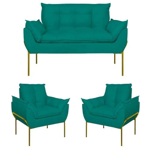 Tipo De Produto: Conjunto para Sala de Estar | Desenho Do Tecido: Liso | Estilo: Moderno | Cor Dos Pés: Dourado | Unidades Por Kit: 3 | Altura: 86,5 cm | Marca: Balaqui Decor | Tipo de Garantia: Garantia do Fabricante | Coleção de Antiguidade: Não | Móvel Dobrável: Não | Dimensão (A x L x C): 86,5 x 132 x 61 | Estofado: Suede | de Assentos: 4 | Duração da Garantia: 3 meses | Largura: 132 cm | País de Origem: | Profundidade: 61 cm | Peso do Item (itemWeight): 22 kg | Material: Madeira | Fabricante: Balaqui Estofados | Montagem: Montagem completa | Peso Suportado: 150 kg Cor: Azul Turquesa