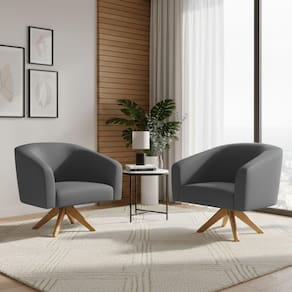 Relaxe com a poltrona D'Rossi Stella, um kit com 2 unidades giratórias em couro sintético grafite para compor sua sala ou escritório. Com estrutura em madeira de eucalipto e espuma de alta densidade, oferece aconchego equilibrado e boa sustentação no uso diário. O assento com percintas elásticas e o encosto fixo proporcionam apoio firme, enquanto a base giratória em madeira garante liberdade de movimento com praticidade. Suas dimensões compactas facilitam a integração em salas de estar, áreas de leitura, consultórios e ambientes corporativos. A combinação de revestimento sintético e design decorativo cria um visual sofisticado e fácil de harmonizar com diferentes estilos de decoração.
