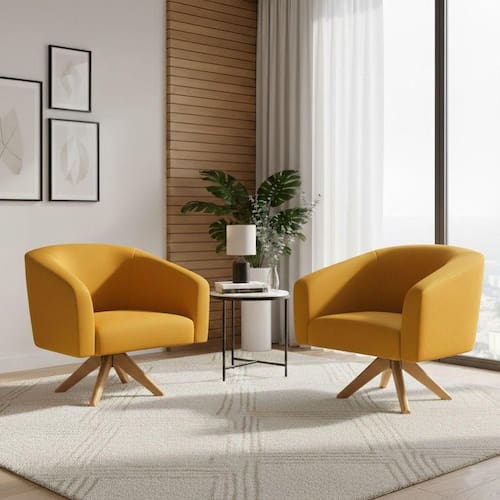 Relaxe com a poltrona D'Rossi Stella, um kit com 2 unidades giratórias em veludo mostarda para compor sua sala com conforto e estilo. O conjunto oferece assento acolhedor e sustentação equilibrada, ideal para uso prolongado em ambientes residenciais ou corporativos. A estrutura em madeira de eucalipto, combinada com espuma de alta densidade e revestimento em veludo, proporciona firmeza, toque macio e sensação aconchegante ao sentar. A base giratória em madeira facilita o movimento e a interação no ambiente, enquanto encosto e assento fixos garantem postura estável em longas conversas ou momentos de leitura. Com projeto pensado para unir charme e funcionalidade, a linha Stella se adapta a sal