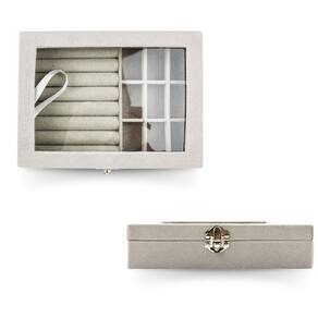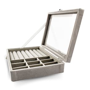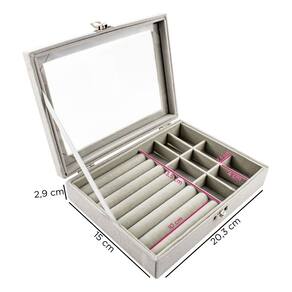 Contém: 02 - porta joias com divisórias removíveis, tampa acrílica e forro de veludo cinza