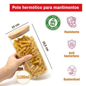 Fabricado em vidro borossilicato de alta qualidade, é resistente a variações de temperatura e não absorve cheiros ou sabores, garantindo um armazenamento higiênico e seguro. Sua tampa de bambu com vedação em silicone proporciona um fechamento hermético, impede a entrada de ar e umidade conservando os alimentos por mais tempo.