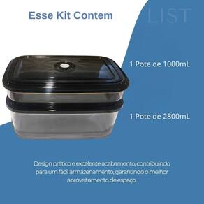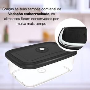 Potes Conjunto herméticos conjunto 2 unidades AERUM 1L + 2,8l Cor: Preto Kit com 2 Potes Herméticos com Botão de Sucção - Transparente, Empilhável e Seguro para Alimentos Preto ou Vermelho O Kit de Potes Herméticos é a solução ideal para quem busca praticidade, conservação e organização na cozinha. Com design moderno e funcional, cada pote possui botão de sucção de ar e anel de vedação na tampa, garantindo fechamento hermético e preservando os alimentos por muito mais tempo. Fabricados em material transparente, resistente e seguro para alimentos, os potes permitem visualizar facilmente o conteúdo e podem ser empilhados, otimizando o espaço em armários, geladeiras e prateleiras.