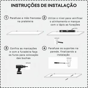 - Instruções de Montagem: Posicione O Produto na Parede, e Marque Com um Lápis o Local Onde Estão os Furos Das Prateleiras. Com Uma Furadeira, Faça os Furos Nos Locais Marcados e Insira a Bucha e Suporte de Embutir Que Acompanham O Produto Então Encaixe A. Prateleira ou Nicho.