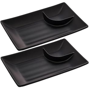 Garantia: 90 dias / Peso: 0,220kg / Cor predominante: preto / Ref: 7798138213258; Dimensões de cada prato: 19cm (C) x 12,5cm (L) x 3cm (A); Dimensões área de uso de cada molheira: 6cm (C) x 5cm (L) x 1cm (A); Material: melamina; Conteúdo: 2 pratos para comida japonesa.