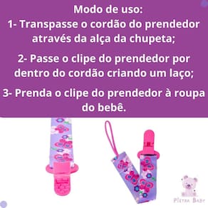 Além disso, o prendedor de chupetas Pietra Baby é compatível com a maioria dos modelos de chupetas, oferecendo versatilidade e praticidade. Ele pode ser preso à roupinha, no babador, na bolsa ou onde mais for conveniente para você e seu bebê. Marca: Pietra Baby Ean: 7908639016085